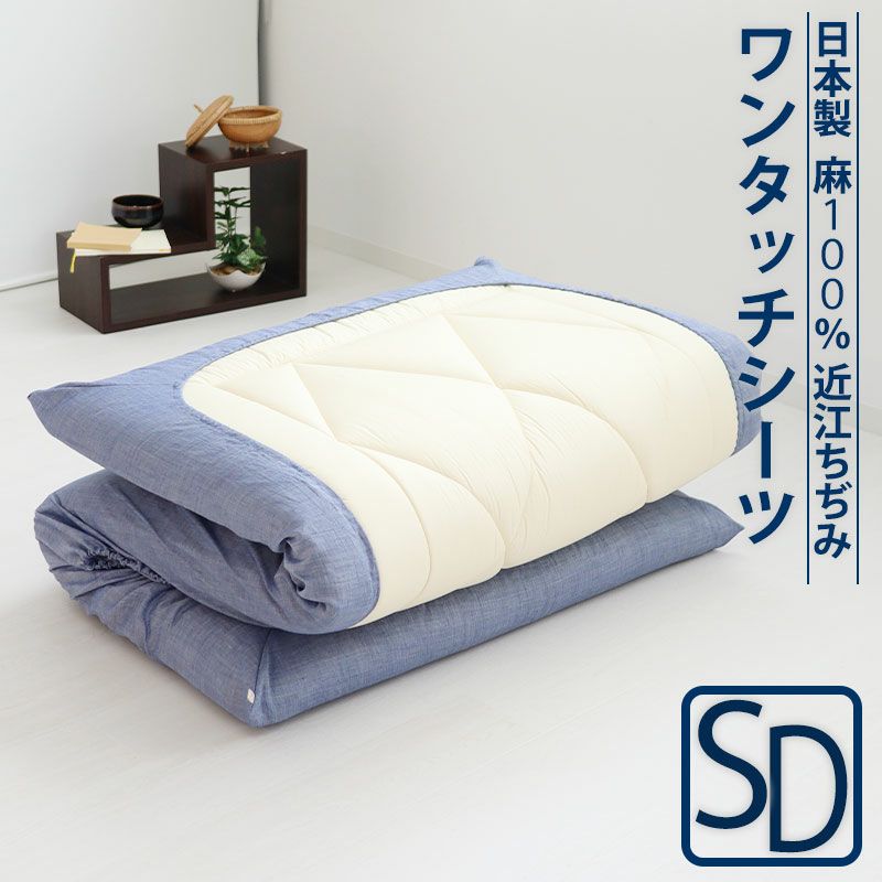 夏に最適なひんやり近江ちぢみ麻から取外し簡単なワンタッチシーツのセミダブルサイズです!涼感たっぷりの先染で見た目も涼しく、独特のシャリ感でべたつかず快適に夏をお過ごしいただけます!