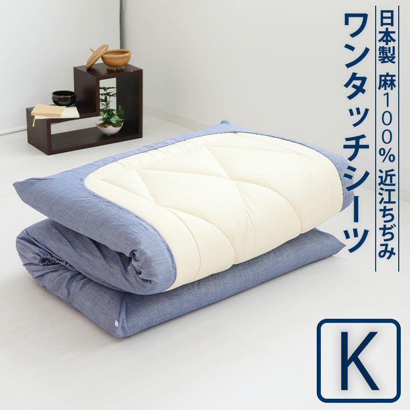 夏の大人気素材、麻のワンタッチシーツのキングサイズです!近江ちぢみならではのシボ加工によるシャリ感ではりつきにくく、高級感あふれる先染が見た目も優雅に夏を快適にお過ごしいただけます!