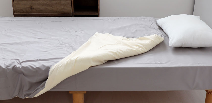 柔らかくなめらかでそっと肌に寄り添うようなやさしい肌触りです。点で支えるマットレスに置いてみても、マットレスの点に添っているのがわかります。