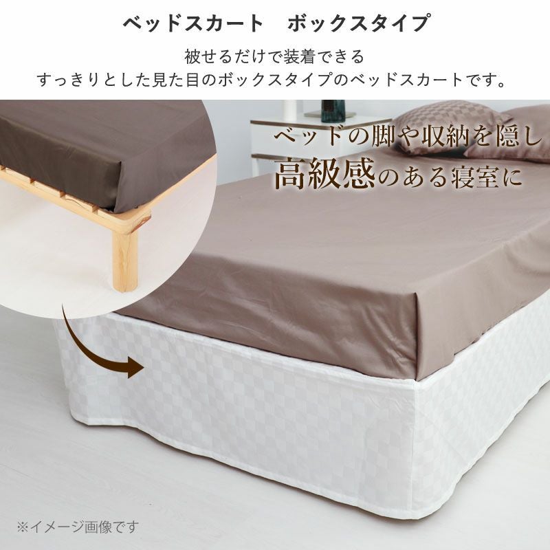 複数のベッドを連結した大きなサイズも1台のファミリーサイズも対応!超ビッグ、ワイドキング・ファミリーサイズのベッドスカート(ボックスタイプ)。落ち着いた光沢のチェック柄。被せるだけの簡単仕様で付け外しも楽々です。綿100%、日本製