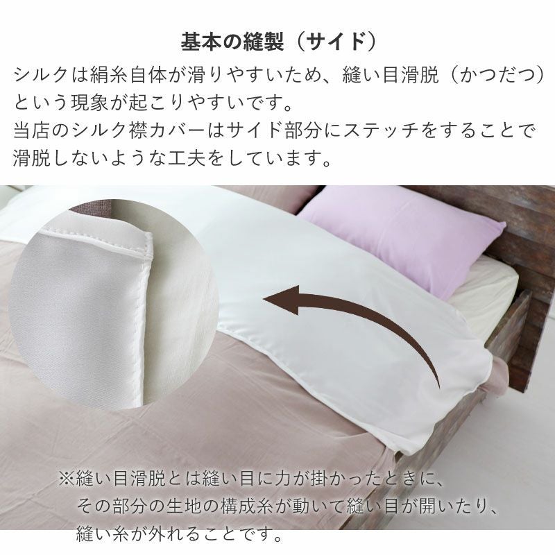 シルクは絹糸自体が滑りやすいため、縫い目滑脱(かつだつ)という現象が起こりやすいです。縫い目滑脱とは縫い目に力が掛かったときに、その部分の生地の構成糸が動いて縫い目が開いたり、縫い糸が外れることです。当店のシルクカバーはステッチをすることで滑脱しないような工夫をしています。