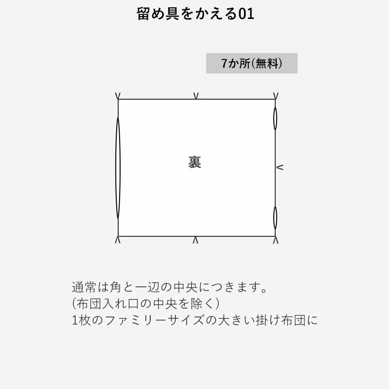 掛布団カバーとお布団とを固定する留め具をお付けできます。また、種類もかえられます。お布団によって数や位置の違うものがありますので、数を増やす場合は一部有料となります。