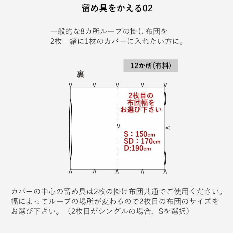 一般的な8カ所ループの掛け布団を2枚一緒に1枚のカバーに入れたい方に。カバーの中心の留め具は2枚の掛け布団共通でご使用ください。幅によってループの場所が変わるので2枚目の布団のサイズをお選び下さい。(2枚目がシングルの場合、Sを選択)
