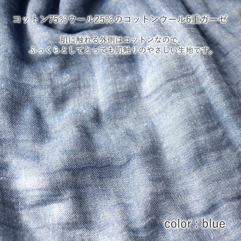 コットン75%、ウール25%使用のチクチクしないコットンウール6重ガーゼ