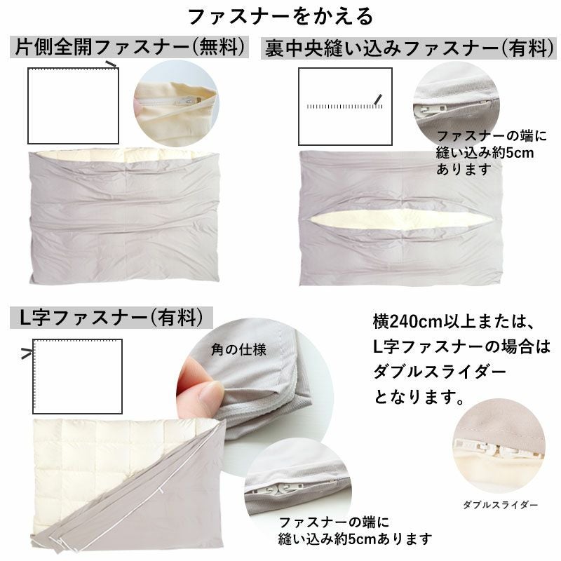 お布団を出し入れするファスナーの種類、位置をかえられます。種類によって一部有料となります。