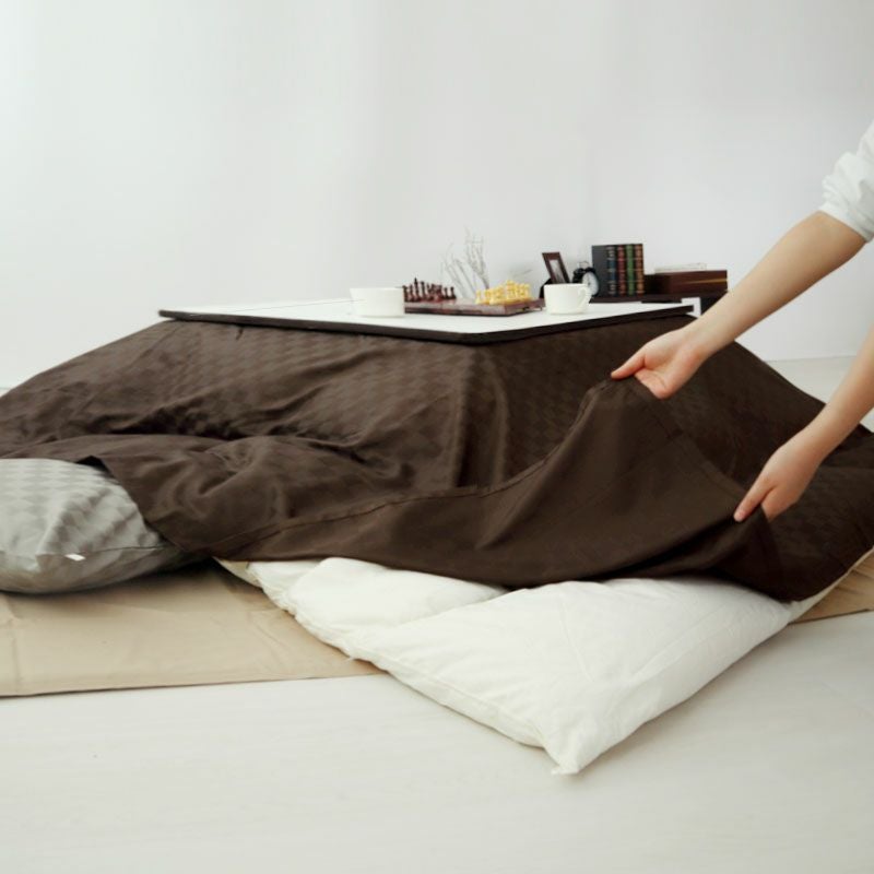 自由度が高いこたつ上掛けは、こたつ布団の上に掛けて使用します。こたつ上掛けのサイズは、こたつ布団のサイズタグの布団サイズを参考にお選びください。布団を完全に覆いたい場合は、お好みに合わせて+5cmなど少し大きめサイズをお選びください。