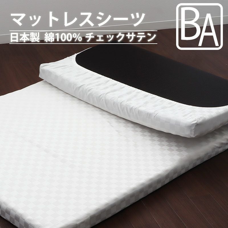 蒸れにくく年中快適な綿100%のベビーサイズマットレスシーツ。昼夜サテン織りのブロック格子柄で無地にアクセント。サイズオーダー対応の安心安全の日本製。