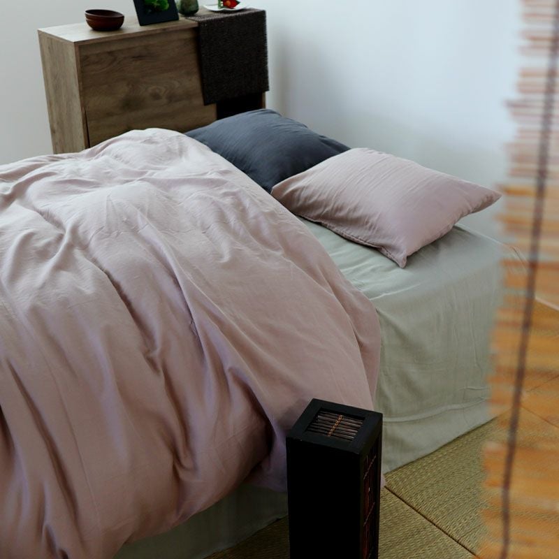 少し青みがかったピンクでかわいくなりすぎずに、寝室にそっとなじむ。