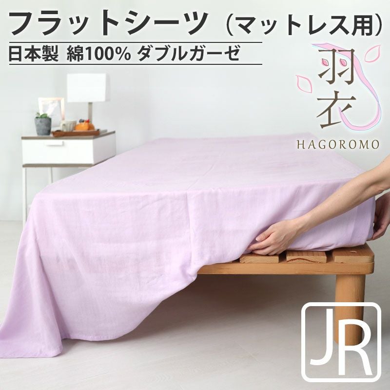 マルチカバーとして様々な用途で使えるマットレス用フラットシーツのジュニアサイズ。極細の80番手糸を使用、肌沿いのよい柔らかでさらっとしたダブルガーゼだからデリケートなお肌の方にもおすすめ!オーガニックコットン100%でとっても優しい。日本製
