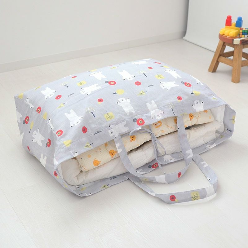 北欧キッズプリントダブルガーゼのお昼寝布団バッグはかわいいキッズ柄なので持ち運びも楽しい!サイズ自由自在で大きめお布団セットに着替えまで入る特大サイズまでお選びいただけます。生地が分厚くないので、くるくるっとまとめたり折りたたんだりと収納しやすく、持ち運びも楽々です。
