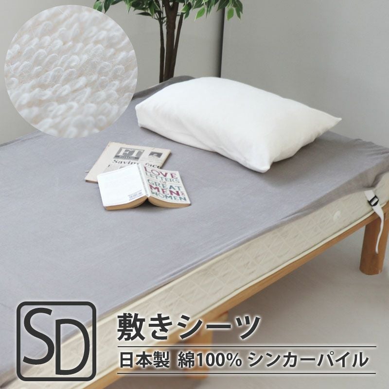 ふわっとソフトな肌触りのオーガニックコットンシンカーパイルの敷きシーツ(四隅ゴム付きシーツ)セミダブルサイズ。肌にあたる部分はオーガニックコットン100%。四隅のゴムで着脱も楽々、安心の日本製でオールシーズンご使用いただけます。