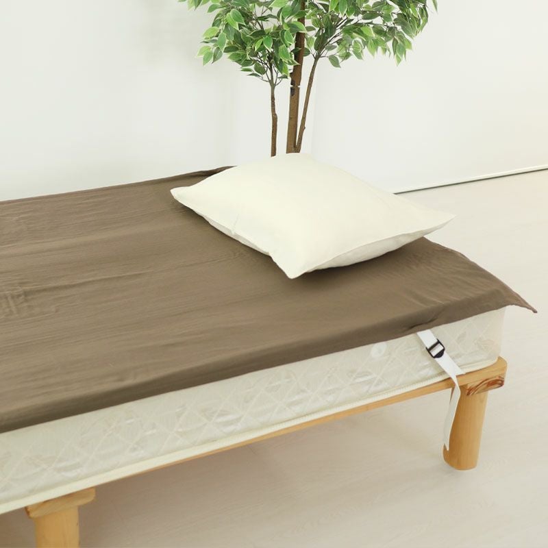 シーツ着用時もアジャスター付きゴムでしっかりフィットする敷きシーツ(四隅ゴム付きシーツ)。汚れと汗のにおいを予防する抗菌防臭加工ピーチフレッシュ加工済 ふわふわダブルガーゼ綿100%日本製 敷きシーツファミリーサイズ・複数連結