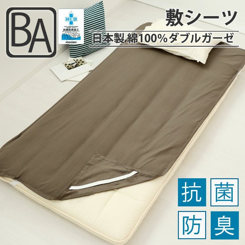 柔らかな肌触りが心地良い綿ダブルガーゼのベビーサイズの敷き布団用フラットシーツです。汗かきの赤ちゃんに嬉しい抗菌、消臭機能付きで、抜群の通気性で蒸れにくく快適にお使いいただけます。