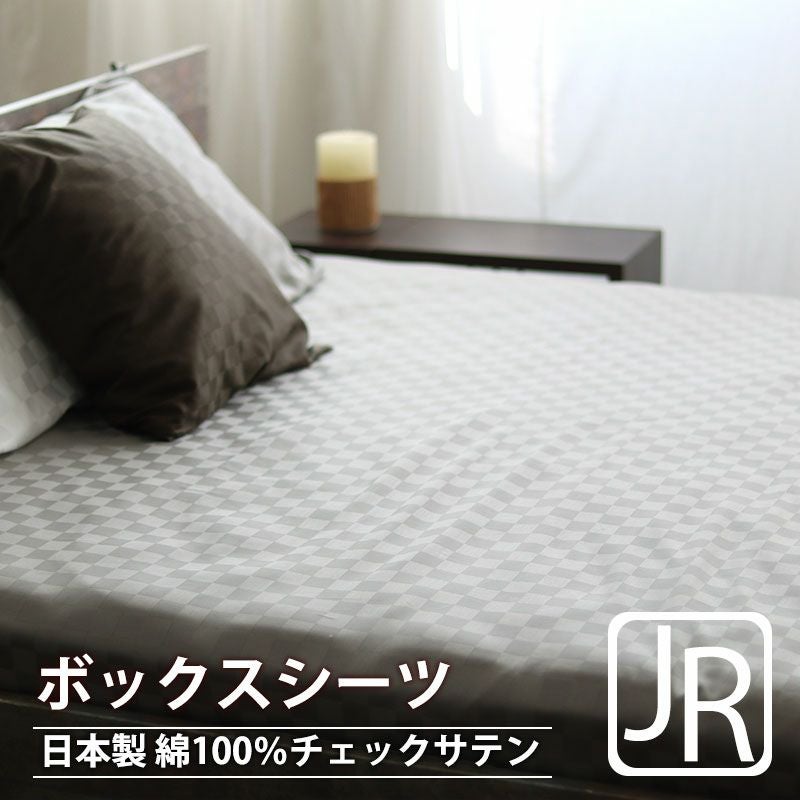 おしゃれでモダンなブロックチェック柄のボックスシーツのジュニアサイズです。昼夜サテン織ならではの高級感あふれる光沢と柔らかな肌触りで、ホテルでくつろいでいるかのような気分にさせてくれます。