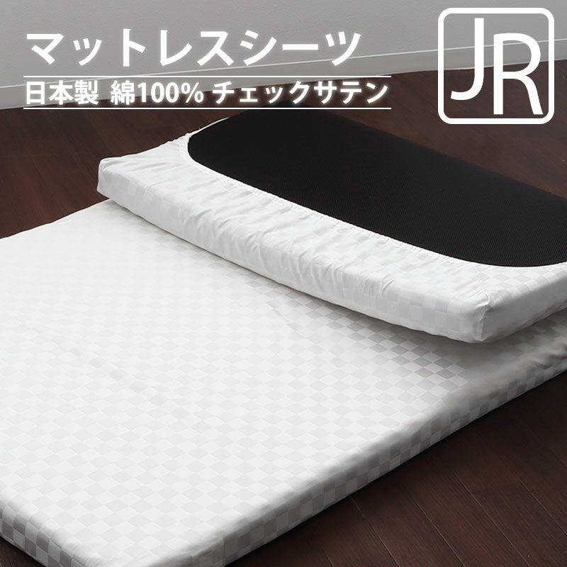 光沢のコントラストが美しいブロックチェックサテンでお作りした、マニフレックス、ロマンスエコー、エアーなどの人気マットレスのジュニアサイズ対応シーツです!長綿ならではのさらりと滑らかな肌触りが心地良い素材です。