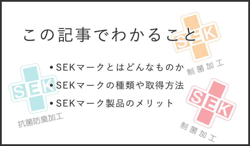 SEKマークという言葉を聞いたことはありますか?SEKマークとは、一般社団法人繊維評価技術協議会(JTETC)が実施する認証制度で、「抗菌防臭加工」や「制菌加工」などがあります。こちらの記事では、S...