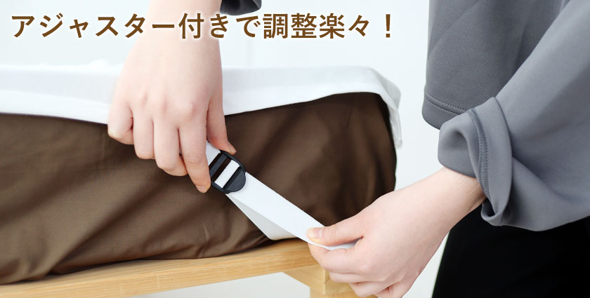 当店つくるカバーの四隅ゴム付き敷きシーツは、アジャスターがついているので、より寝具に合わせてぴったりと装着することができます。また、敷き布団やマットレスは使用している間にへたってしまって高さが変わったり、敷きシーツのゴムが伸びてしまったりすることがあります。その場合も、アジャスター付きゴムなら簡単に調節して、ぴったりと付けることができます。