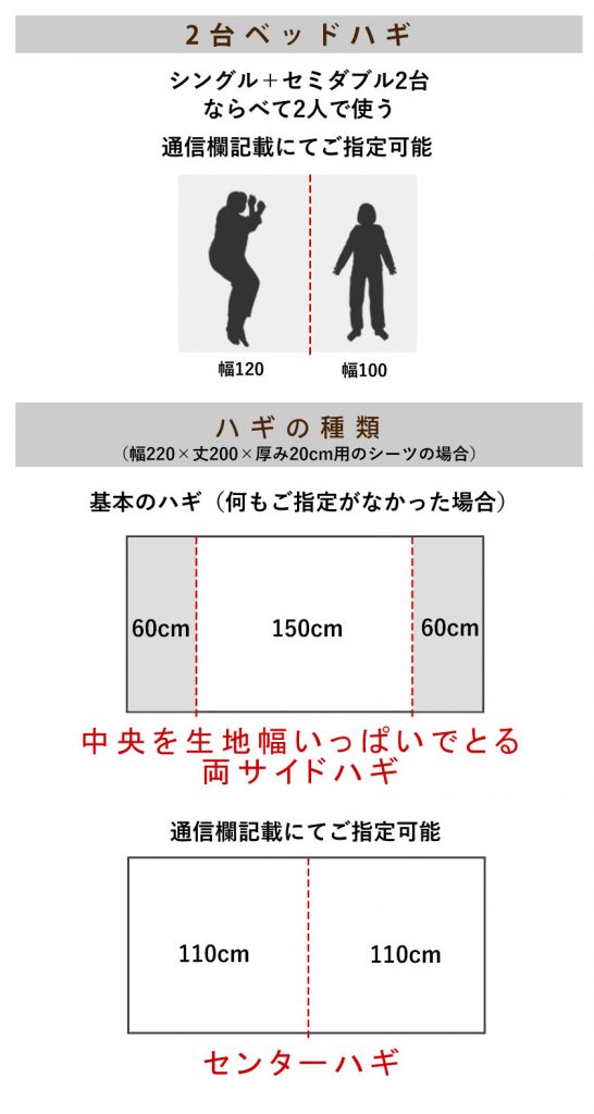 シーツ用の生地の幅が通常150cm程度になるので、約220cmほどのシーツとなると、どうしても継ぎ目が入ってしまいます。夫婦やカップルなどお二人でお休みになる場合にはマットレスの上に継ぎ目が入るとどちらにも継ぎ目が当たらずにお眠りいただけます。なのでシングルのマットレスを2つ並べて2人で使用する場合には、ベッドに合わせて、ベッドとベッドの境目に継ぎ目を入れるか、シーツのちょうど真ん中に継ぎ目を入れるのがおすすめです。(今後は継ぎ目が入らないような超広幅の生地も開発予定です。)