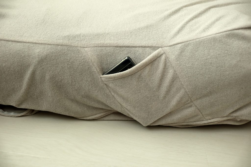 スマートフォンやリモコンを収納できるサイドポケット付き。