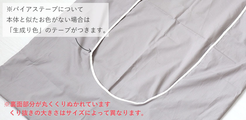 旅館などでみかける、すばやく脱着可能な裏面を丸く抜いた、丸ぐりタイプに変えられます。ファスナーやゴムはつきません。(片側ファスナー以外の仕様を選ばれた場合をのぞく)