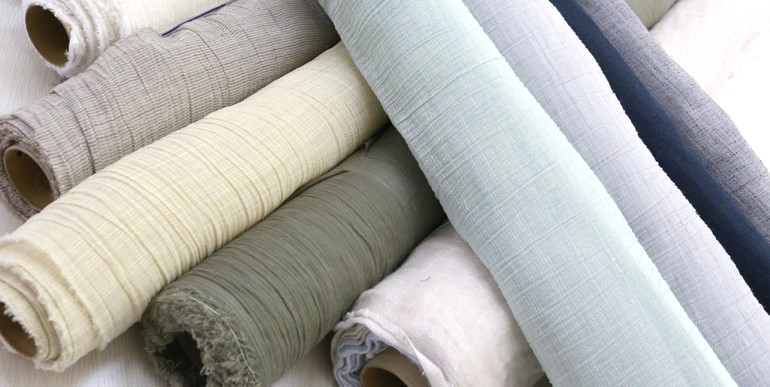 使用している素材は全て当店オリジナル。心地よい天然素材にこだわり、生地屋さんと相談しながら、糸から織り方、編み方、染め方など全て当店で企画しています。イメージした色になるまで何度も試験染をしてもらったり、納得できる肌触りになるまで何度も試織をしてもらったり、時には現場の職人さんと話し合いをするために現地まで伺うこともあります。